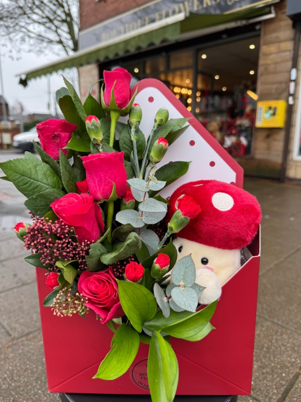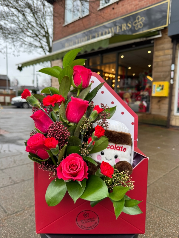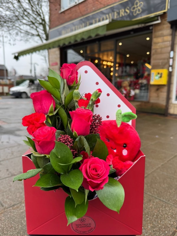 A lovely selection of valentines flowers along with a cute teddy. Choose from fun guy, apple of my eye and I'm Nutella about you.